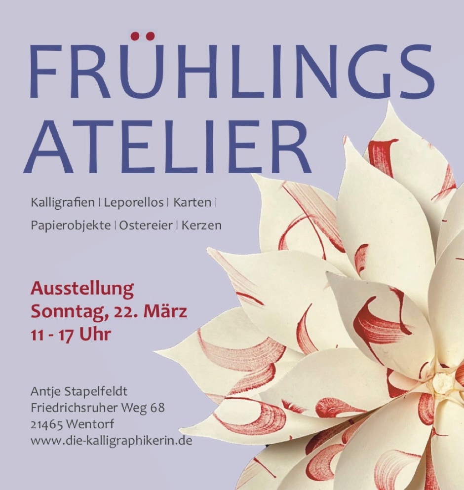 Am 22. März 2026 öffne ich die Türen zu meinem Atelier und lade herzlich zur Frühlings-Ausstellung in der Zeit von 11 - 17 Uhr ein.